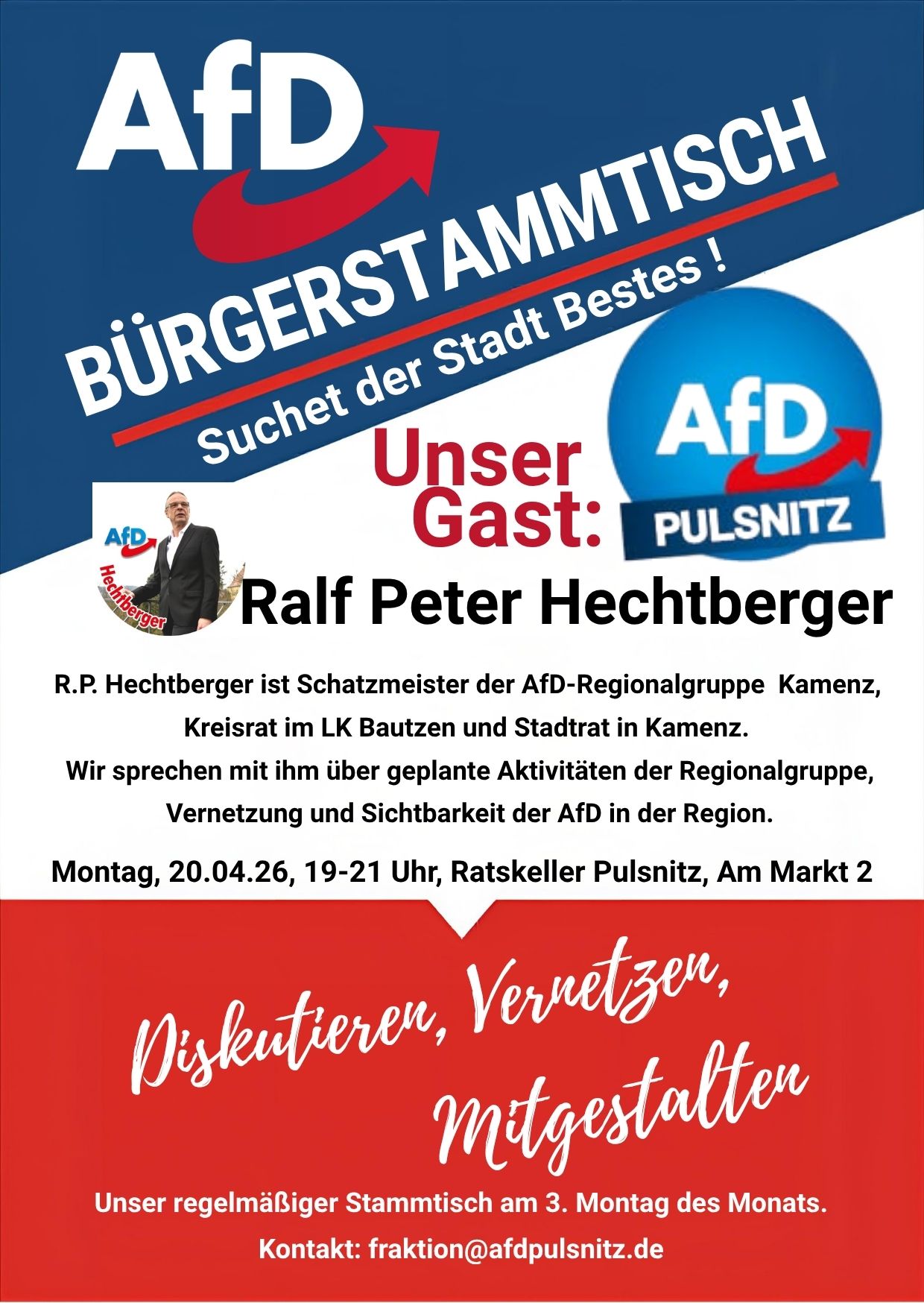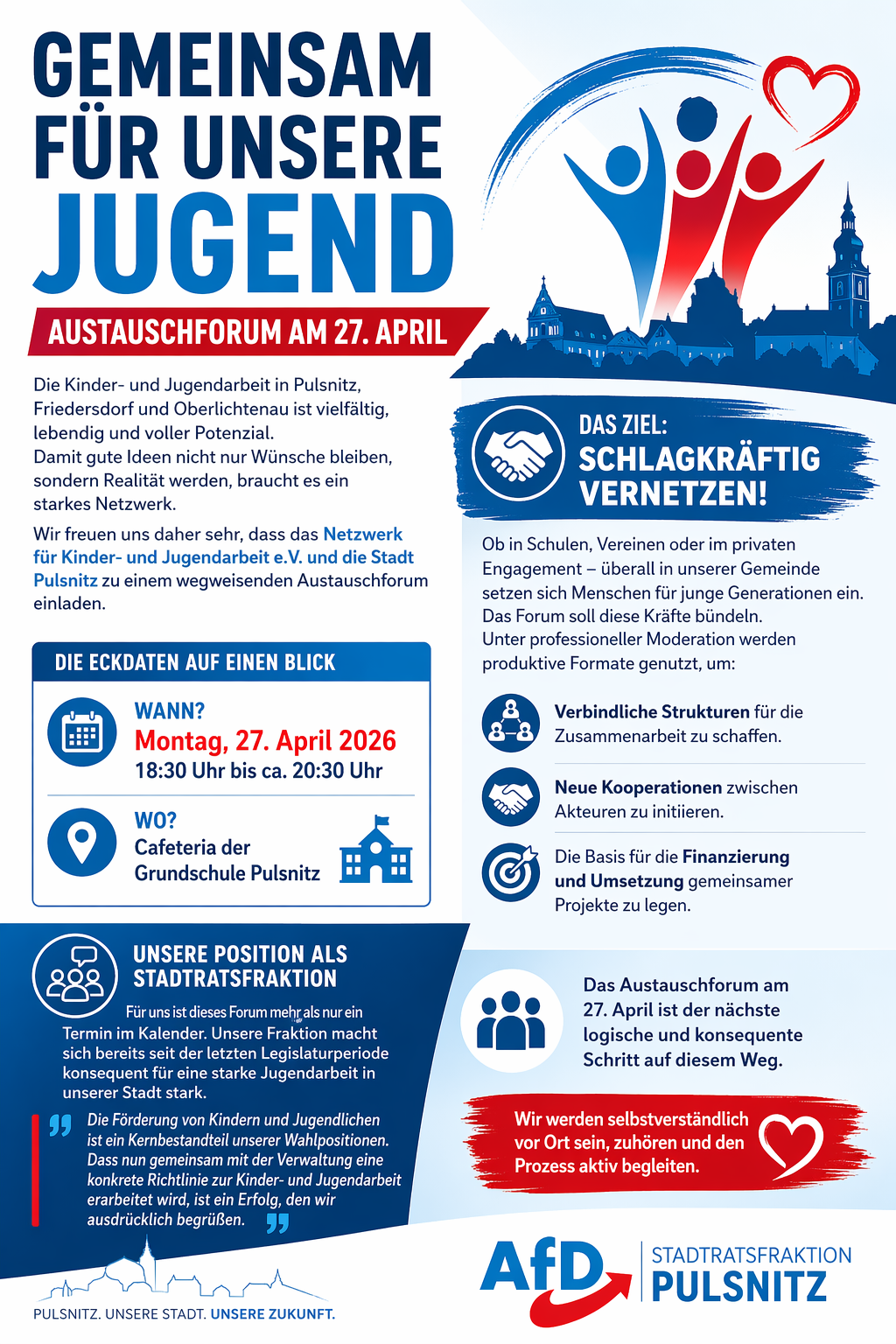 Umso mehr begrüßen wir den aktuellen Austausch und die Möglichkeit, gemeinsam mit den Bürgerinnen und Bürgern an zukunftsfähigen Lösungen für Pulsnitz zu arbeiten.